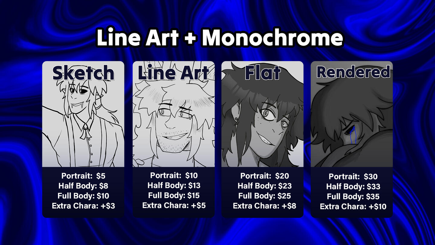 Prices may be subject to change depending on the complexity of the character or added background if it's a full color commission. Changes will only be made before the sketch phase passes approval from the client.
